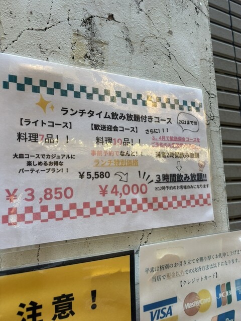 | サービス | 2時間半以上の宴会可、お祝い・サプライズ可(バースデープレート)、ドリンク持込可、ハッピーアワー、テイクアウト、デリバリー |
