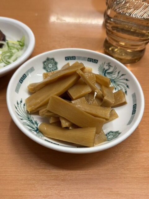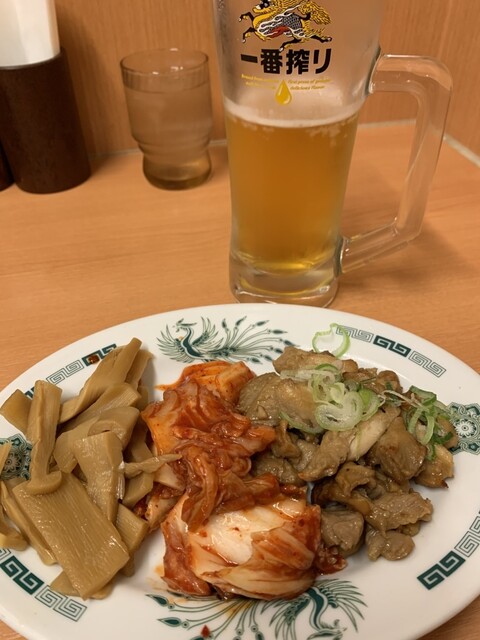 おつまみは焼鳥、キムチ、メンマの三種盛り、