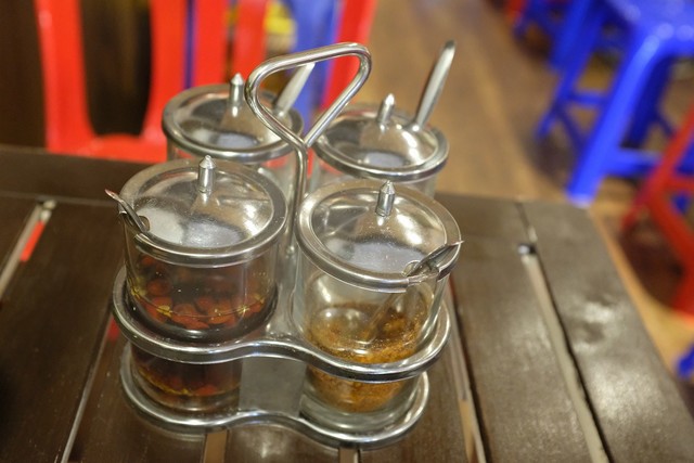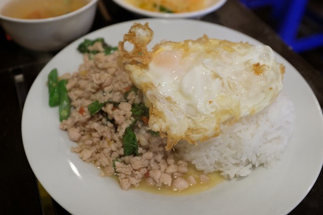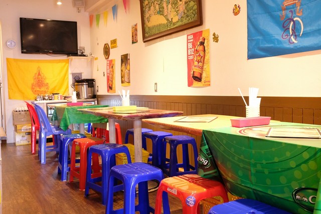 店内はタイの屋台のような折りたたみテーブルにプラ椅子でローカル感満載。こういう雰囲気好きだなぁ。