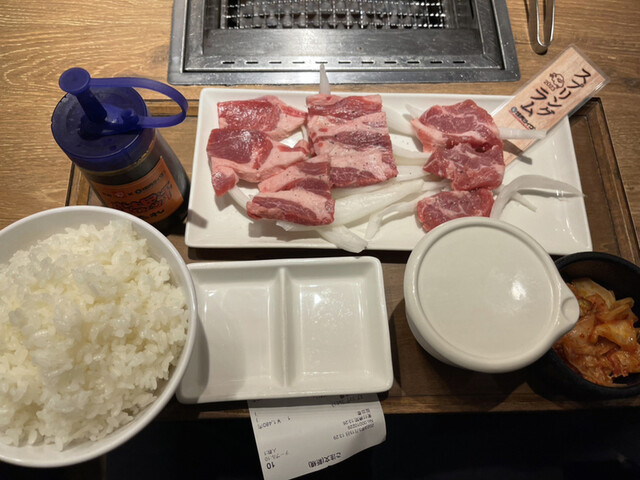 一番安いランチセットはミックスカルビセット 肉並で580円。以前は100gから50g刻みの販売だったが、いつからかグラム表示を止めて肉並などの表記になってしまい分かりづらい。価格はそのままでもこっそり量を減らしているんだろうなと思っていたら、画面外のPOPに肉並100g肉中...