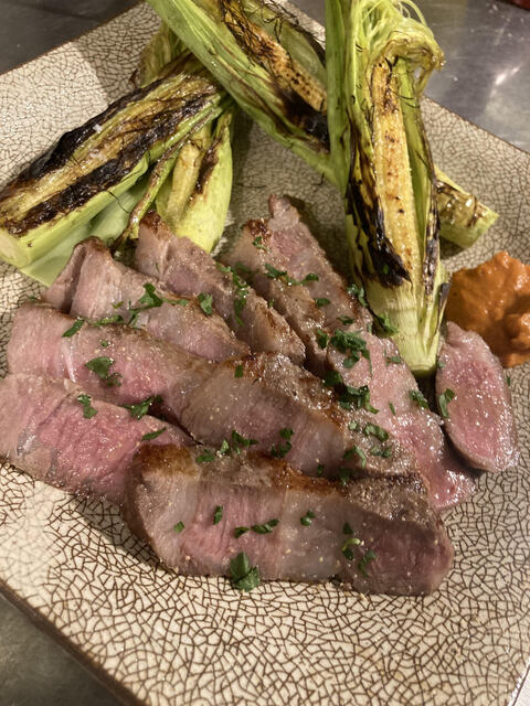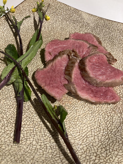 牛トモサンカクのロースト紅菜苔のサラダ (by お店)