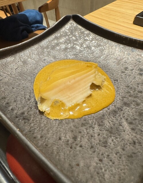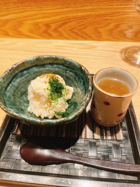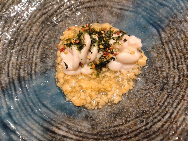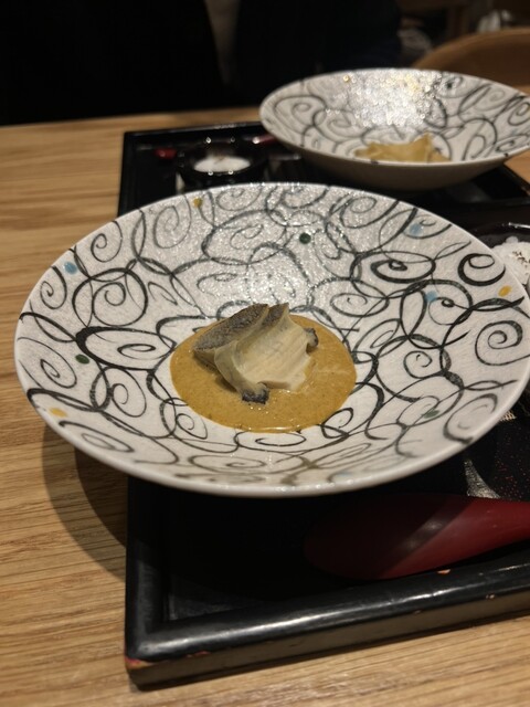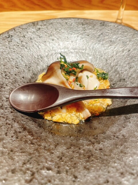 特に印象的だったのは「蒸し鮑のトリプリング」。6時間煮込んだ柔らかな鮑に肝ソース、炊いた獺祭の酒米を合わせた一品で、肝ソースの濃厚さと酒米の旨味が絶妙にマッチしていました。
