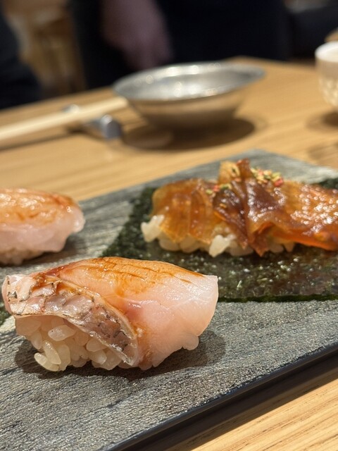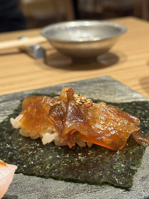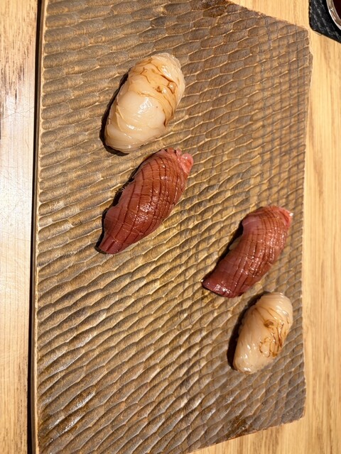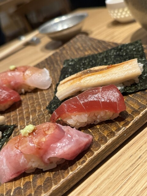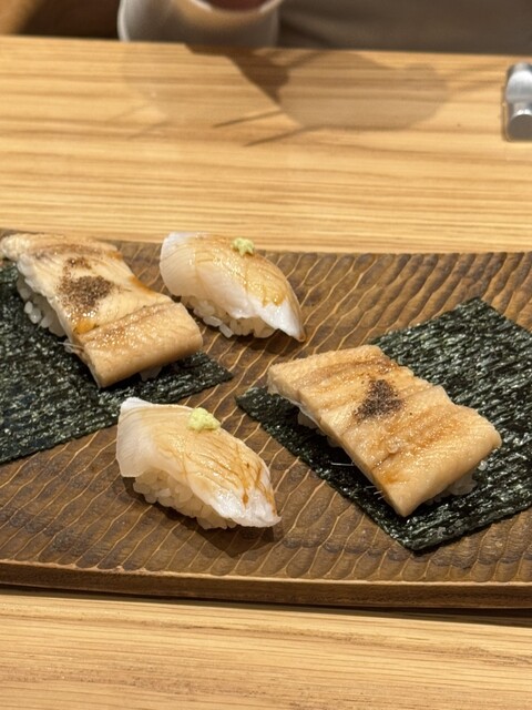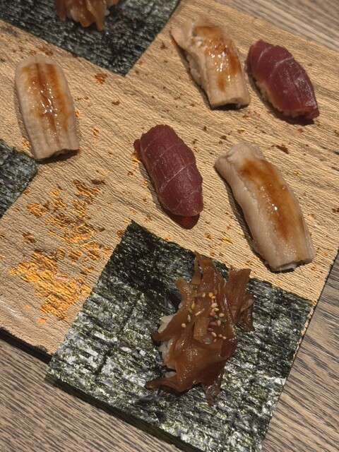 個人的なヒットは、鮑のトリプリングと手巻き穴子中トロや白身の握りも...