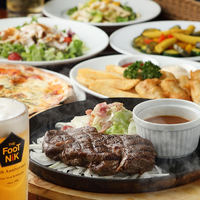 フットニック自慢のワールドワイドなメニューで構成しています! 前菜2種類、冷しゃぶ、当店一番人気フィッシュ&チップス、名物 鉄板ビーフステーキ、ピザも付いてコスパ◎