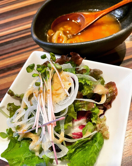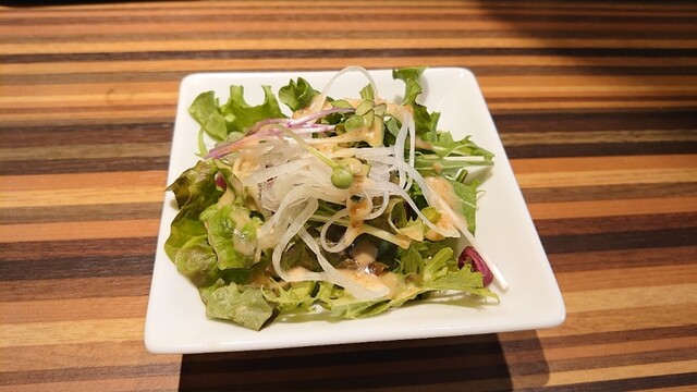 しばらくすると胡麻ドレッシングが掛かったサラダと