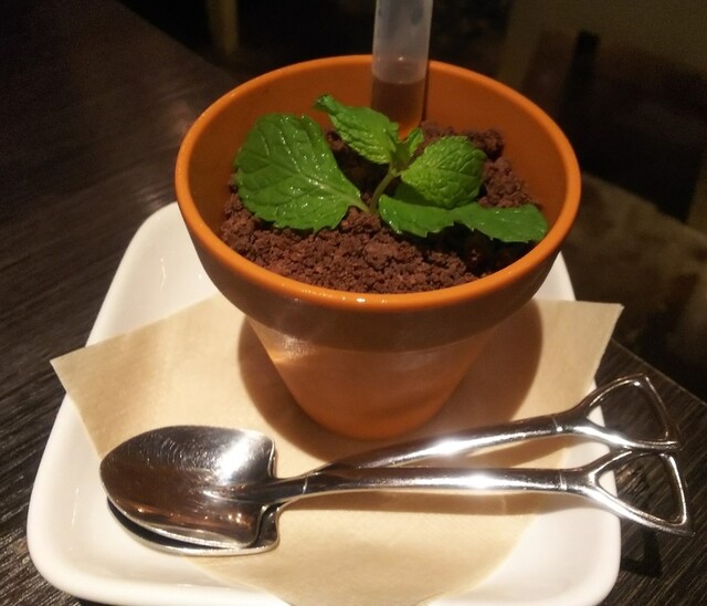 土をイメージしたクランチチョコのサクサクの食感と中のティラミスの層?との相性がすごく良くて、甘さもちょうどよく、ミニスコップで掘りながら食べるのも楽しく、またこれ、注文しよう!と思ったデザートでした。