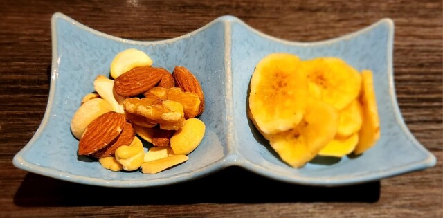 (私達もこの日アルコールは二人ともオーダーしてませんが、チャージ料分としてドライフルーツのバナナチップとミックスナッツがお通しとして出ました)