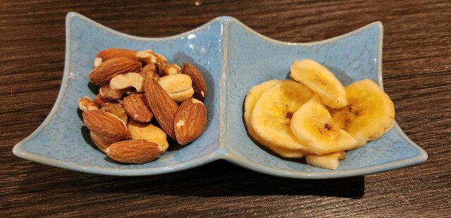 私達も、前回は、二人ともアルコールはオーダーしてませんが、チャージ料分としてドライフルーツのバナナチップとミックスナッツがお通しとして出ましたので。