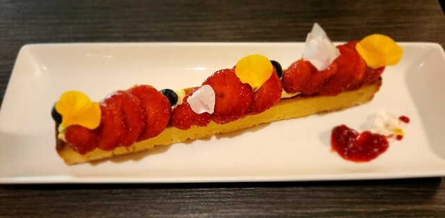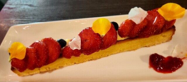 こちらのケーキは、全て手作りなんですが、あまおうのタルトは、あまおうがゴロゴロ、甘さ控えめのチーズケーキベースのタルトの上にのっていて、お花も飾ってあって見た目もかわいく、味もおいしかったです♪