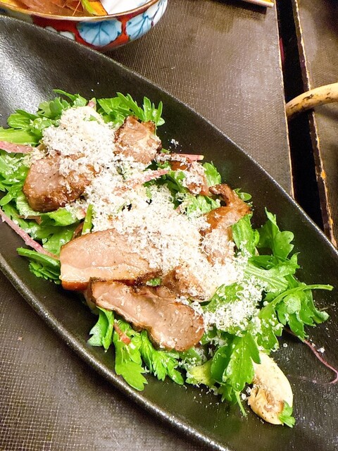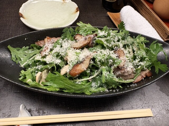春菊とマッシュルームのサラダ自家製鶏ベーコンのせ 1280円