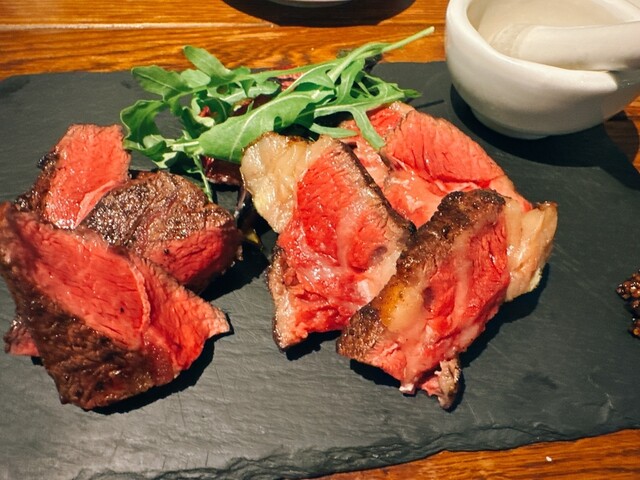 お肉の美味しさってやっぱり熟成させてこそ。最近ではエイジングビーフなども人気だけど、その真髄を感じさせてくれるお店だった。 ランチで利用したけど、メニューはアラカルトでも楽しむことができ、色々な料理を楽しむ事が出来る。メインはもちろん短角牛の炭火焼に決めてたので、前菜的に白子のフリットや短角牛のタルタル、そして短角牛のハンバーグを注文。 まずは短角牛のタルタル。 オリーブオイルたっぷ... 詳細を見る