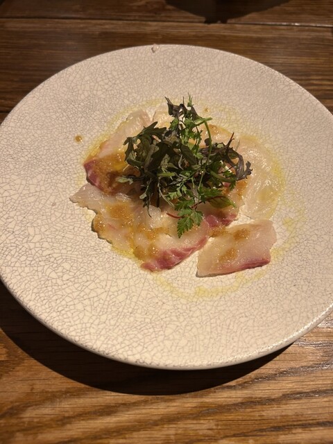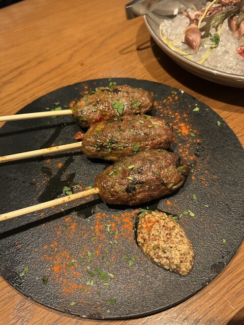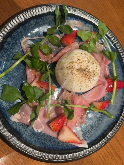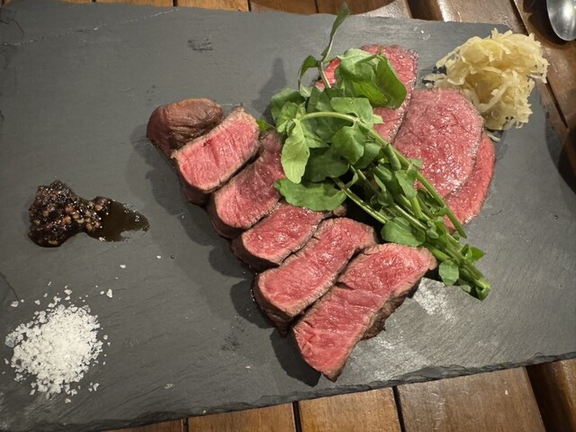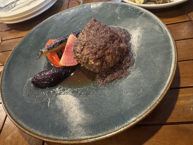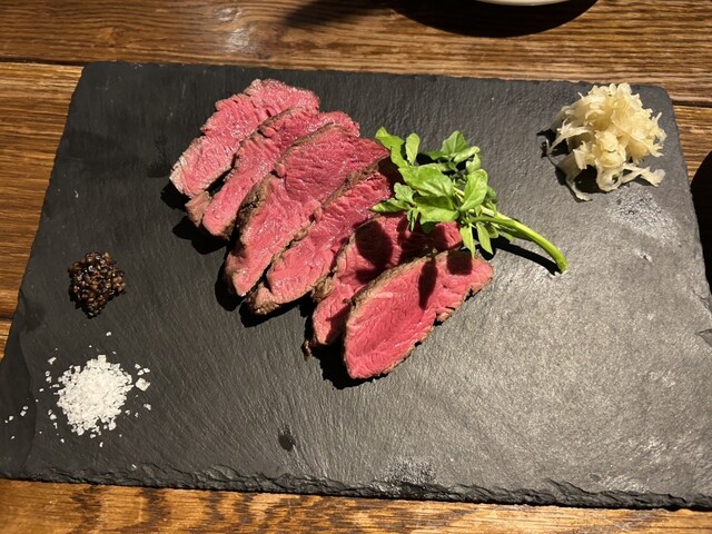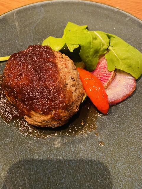 初めて訪問。お通しのとうもろこし冷製スープに始まり、カルパッチョや炭火焼き、ジビエ、ボロネーゼとどれもほんとに美味しい。1番楽しみにしていたお店の売り、吊るし熟成短角牛のハンバーグも絶品!丸ごとトマト...