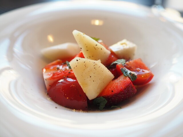 小さな前菜、香住漁港より甘えび、南房総田倉さんより完熟黒イチジク、富山魚津よりサワラ、サルデーニャよりたっぷりカラスミ、口直し、ハンター太田さんより蝦夷鹿、船橋押木養鶏場より紅孔雀卵、京都よりほ...