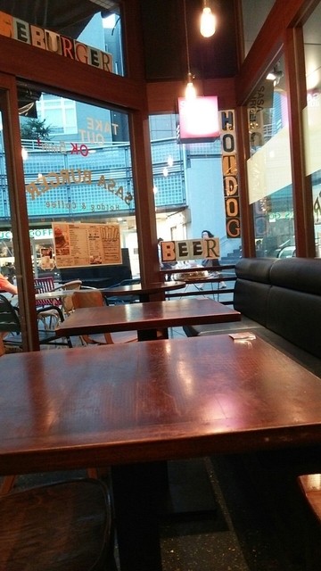 温かみのある木を基調にアメリカンダイナーらしいポップなインテリアが映えるお洒落な店内でデートランチにも使いやすい雰囲気。