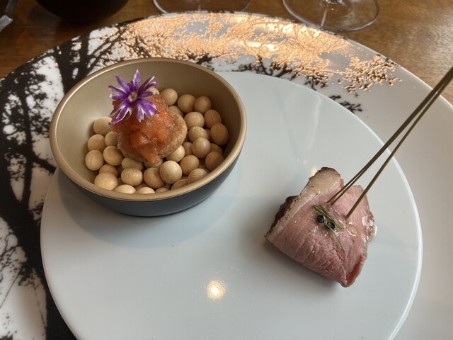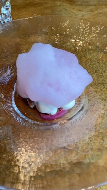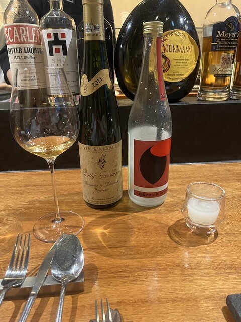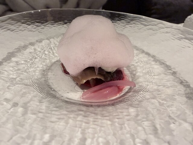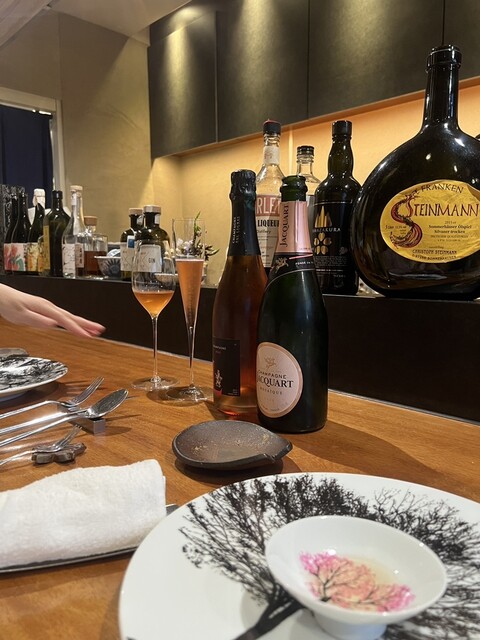 一皿毎に2種類のお酒が提供されます。ワイン&ワインのお皿、ワイン&日本酒のお皿、泡白赤ロゼ色々な組み合わせが楽しいです。日本酒はあまり好まないのですが、ソムリエの方に「より引き立つ流れになる」と勧めら...
