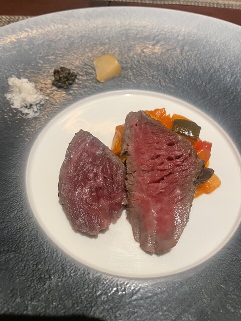 ▶︎仙台和牛"ランプ"炭火焼き パルミジャーノ カンポット生粒胡椒 林檎ピクルス