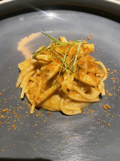 まず、カラスミの塩気が癖になりそうなくらい美味しく、パスタに絡み合って最高でした。鮑が入っていてとても贅沢でした。