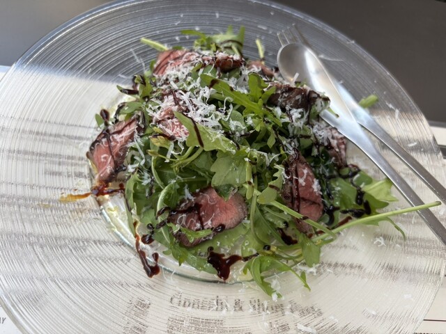 極上黒毛和牛のタリアータと、ルッコラ・セルヴァチカのサラダの、タリアータは、香ばしいお肉でした...