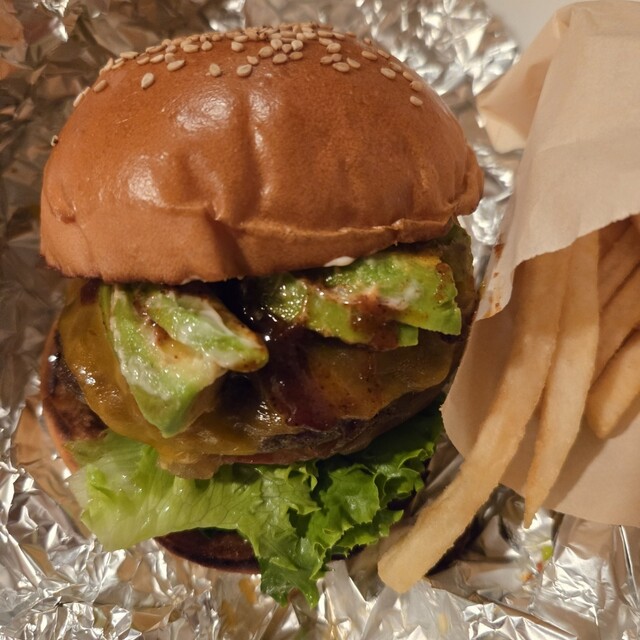 日曜日の11:40頃伺って、待ちなしで入店。 店内は女性も多い。 【注文】 注文したのはアボカドベーコンチーズバーガー(税込2,050円)とグァバジュース(税込550円) 注文から10分ほどで着バーガー。 【お味】 甘味と若干の酸味のあるBBQソース、がっつり牛肉を感じる粗挽きジ... 詳細を見る
