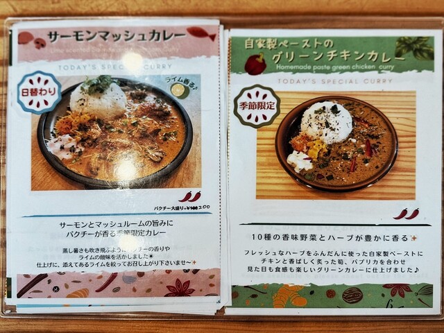 サーモンとマッシュルームを使ったカレーで、パクチーとライムが付属していて風味豊かなカレーです。パクチーの薫りとライムの酸味でスパイシーさにフレッシュさが合わさり美味しかったです。