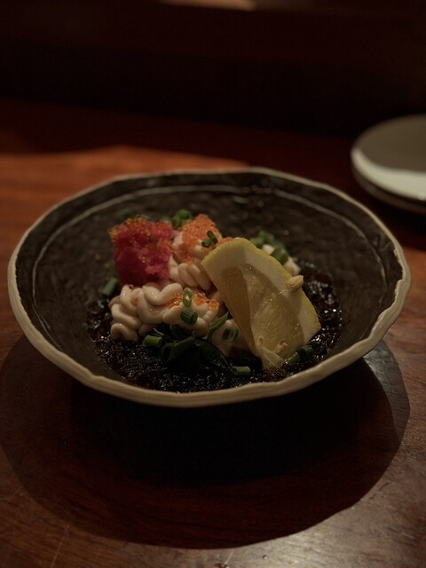 店内は全席カウンタースタイル(?)で、3名でお伺いした際も大きい一枚板のテーブルに他の方と相席の様な感覚になる距離感でカウンター形式で食事を楽しみました。(端っこの席は割と狭いです。)