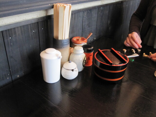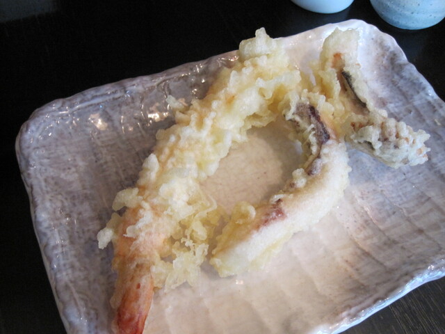 いろんな天ぷらを頂きたいので2種類の天ぷらを2人で選び、食べたのもを適量に盛り分け、かたやざる、そして私は釜揚げをセットアップします。恩やさんはちゃんとお皿を用意して...