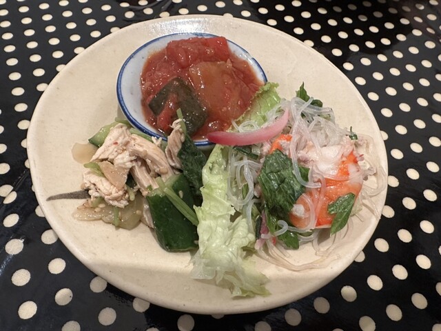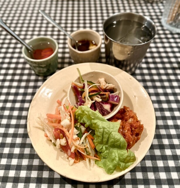 夏季限定の冷麺。付け合わせの前菜3種類とミニデザート・冷たいお茶が付く。ひとつひとつ非常に丁寧に調理されていて、何を頂いても美味しい。前菜のレンコンと山芋のマリネが、食感・味付けが良かった。冷麺の茹で加減が絶妙。