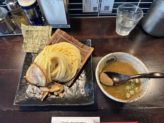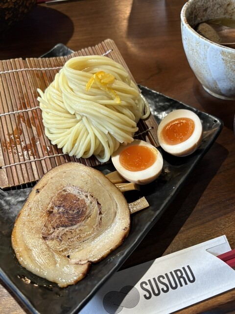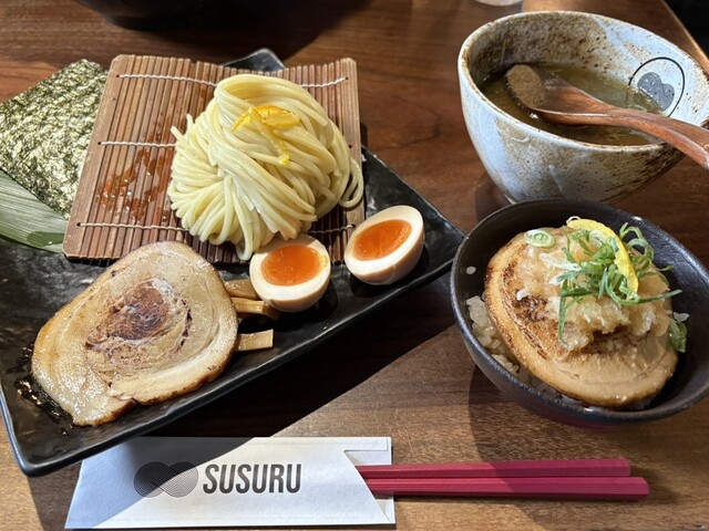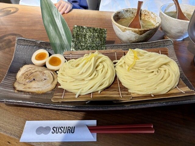 麺は三河屋製麵と共同開発した純国産小麦のモチモチつるつるの中太麺を使用。鶏・豚・魚介を素材から徹底してこだわり、丹念に引き出し、旨味を凝縮した濃厚魚介つけ汁。麺とつけ汁・スープの相性は抜群。2024年6月22日より内装を一新し、リニューアルオープン。新しくなり更に特別な空間になった「すする」をお楽しみください。