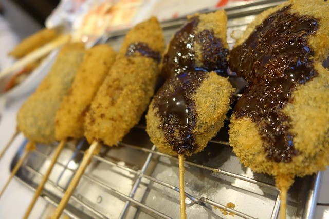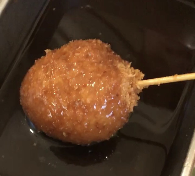 サクサク衣のアツアツの串カツに、秘伝のソースをたっぷりつけて頬張れば、まさに大阪伝統の味!