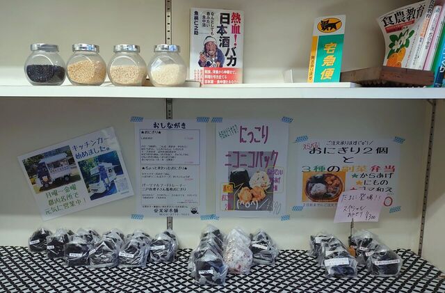 カウンター前には玄米のおにぎりとちょっとした総菜が並んでいる。