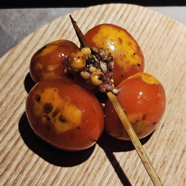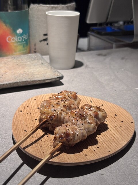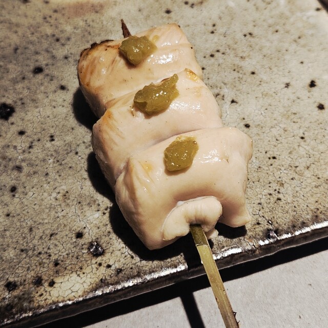 『ちょうちん』(300円)、焼き鳥通の方ならご存知ですが、日本でちょうちんをこんな気軽に食べられるなんて、夢のよう! 玉は大きく、噛むとじゅわっと美味しい黄身エキスが口の中に広がり幸せいっぱい! 『京紅地鶏とりわさ』をオーダー 肉が宮崎の炭火焼き見たいに、しっかり炭の色が付いて焼かれていて... 詳細を見る