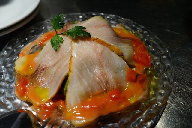 薄切りの鮮魚にラディッシュやマイクロハーブを添えた一皿。見た目にも美しく、さっぱりとした味わいの中に...