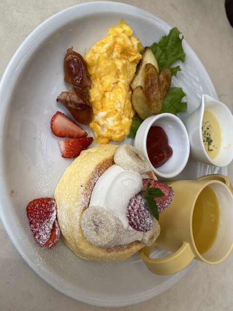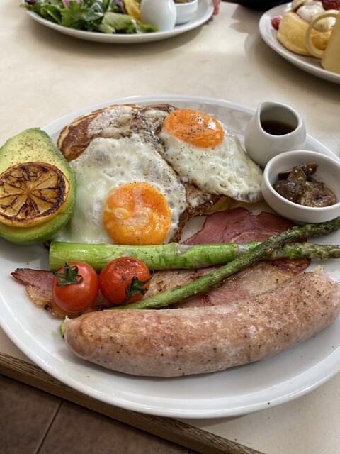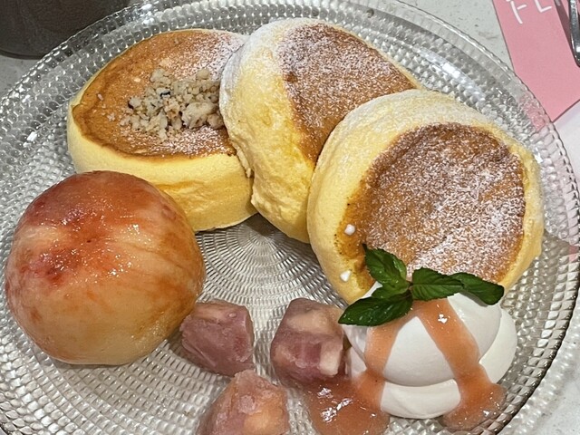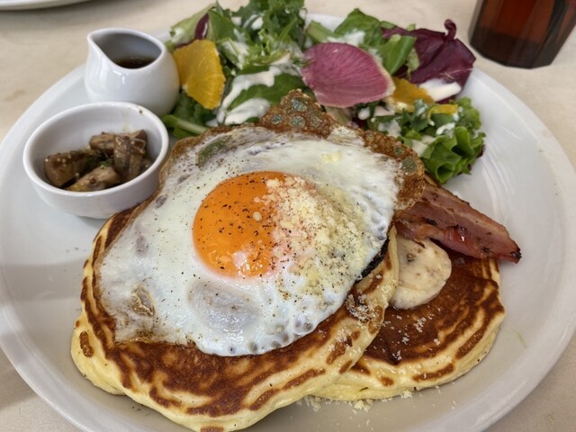 ふわふわ系じゃない食事系パンケーキが食べたくて、こちらのお店が美味しそうだったので訪問を決めました。 友人は季節限定の桃のパンケーキを、私は熟成ベーコン&エッグとクラッシック... 詳細を見る