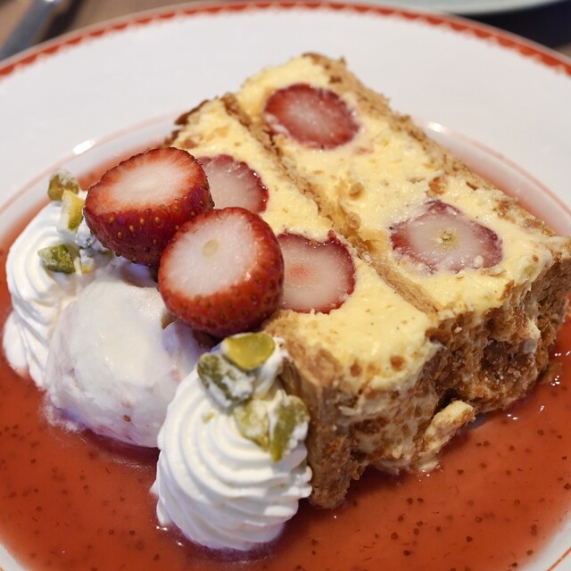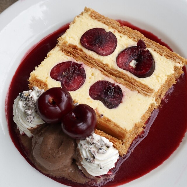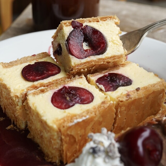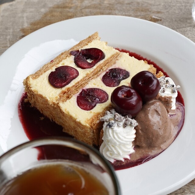 マイレビさんが載せていてずっと気になっていた自由が丘のカフェで出されている季節毎に使うフルーツを変えているナポレオンパイ。 その中でもアメリカンチェリーパイのナポレオンパイが気になっていてやっと来れました。 外観も内観も落ち着いた色を使っていてオシャレ。テラスには緑もあってゆっくり出... 詳細を見る