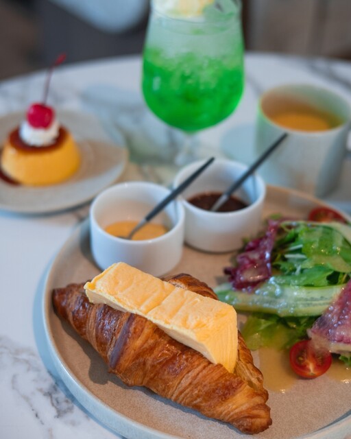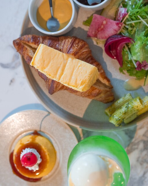 クロワッサンに分厚いぷるぷるの厚焼き玉子が挟まれた一品で、見た目のインパクトはも...
