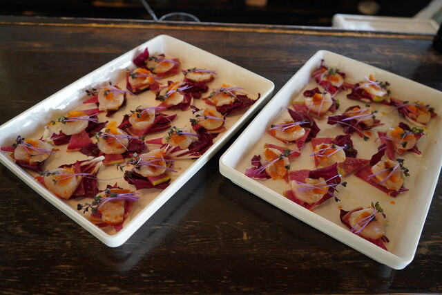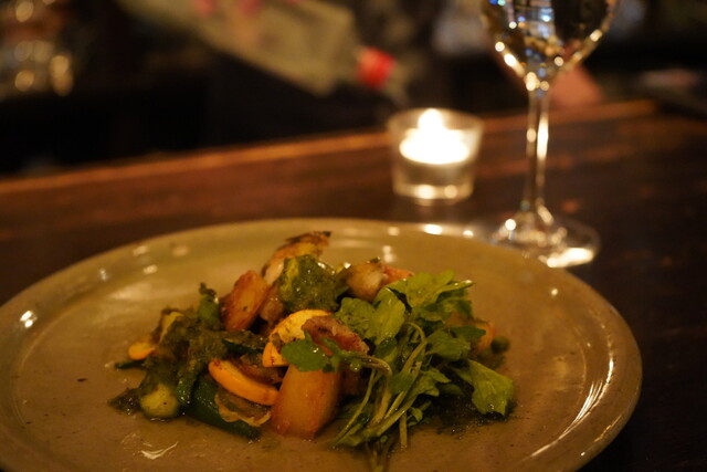 ニジマスとオクラ、カラスミのタルタル (by お店)