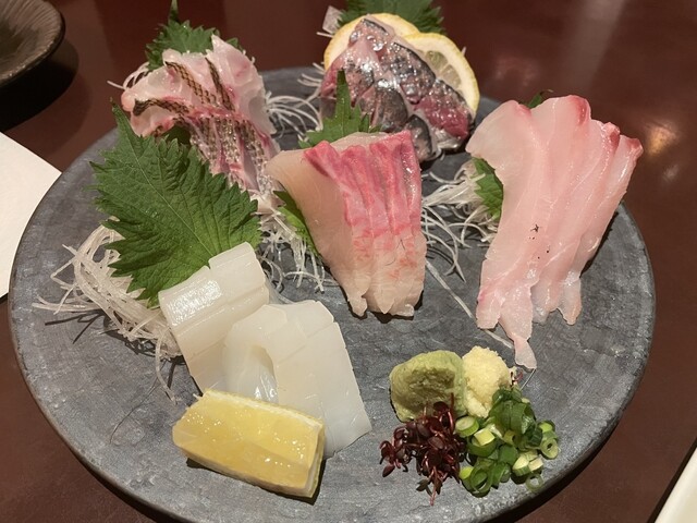 思ったとおり、お刺身美味しかった!付けるタレが薄口醤油と濃口醤油の他に出汁があって、イカと鯵はその出汁に付けて食べました。3種類も楽しめるのは珍しい。盛り合わせで鯵が出てくるのはあまり見かけないけどふわふわで美味しかった。