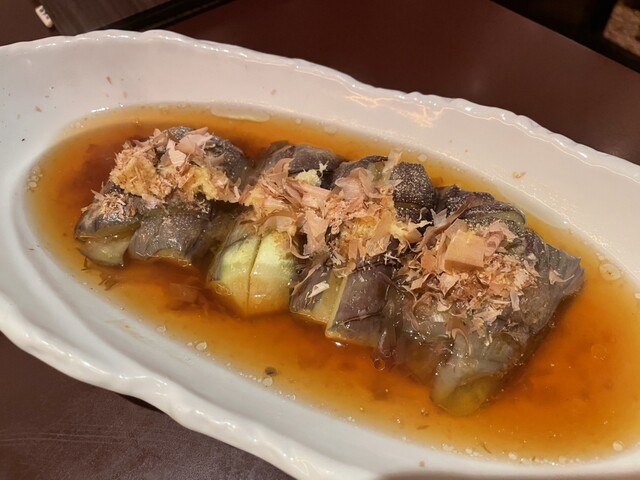 茄子の焼き浸しは味と油が染み込んでいて、お酒がすすむ…!鰹節がまた効いてて美味しい!