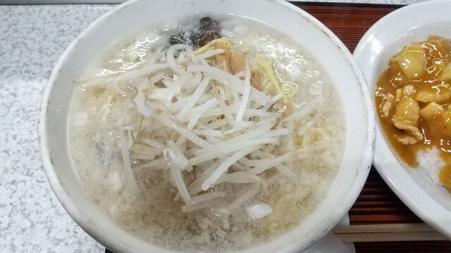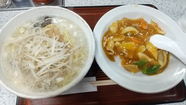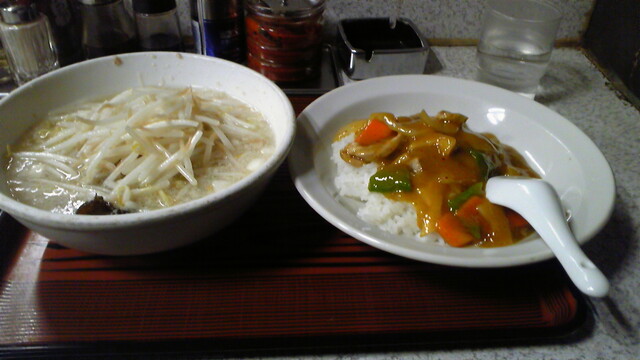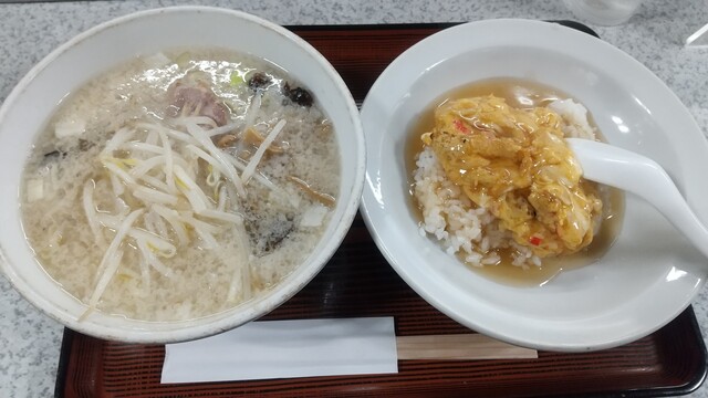 カレーあんかけ飯の様相の半カレーは具材の油通しやラーメンスープを使うしっかり作られたもので食べやすくかなり美味しい