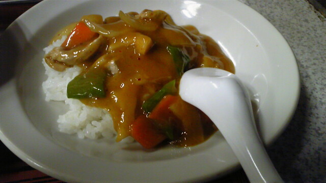 ご飯、カレー(豚バラ、玉ねぎ、ピーマン、にんじん、竹の子)
