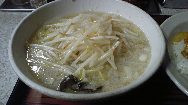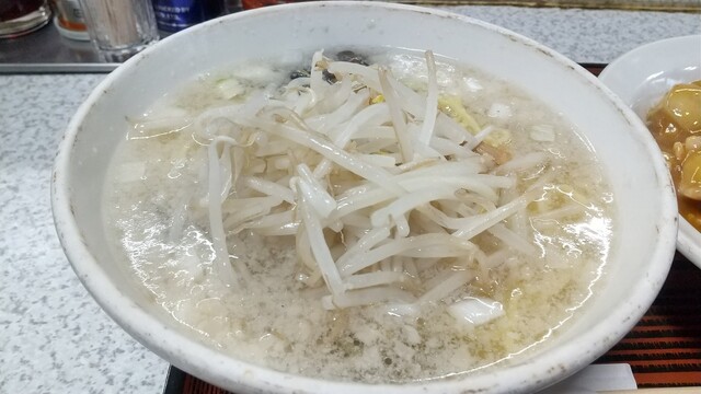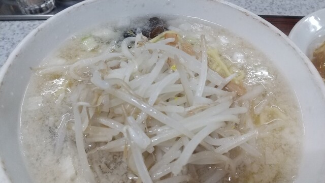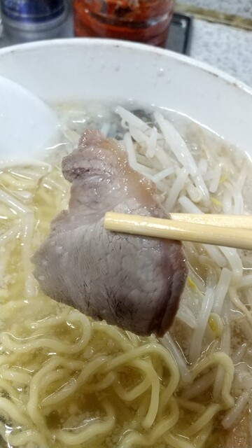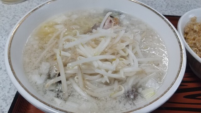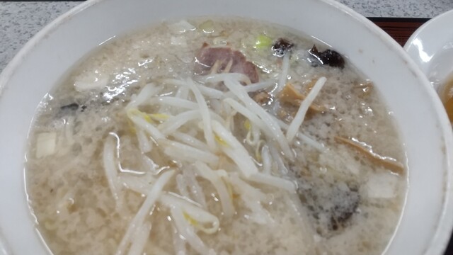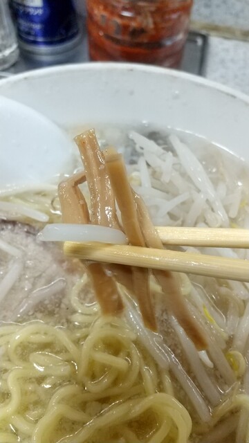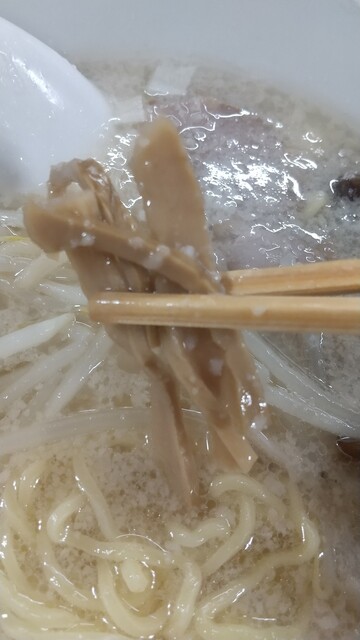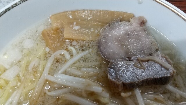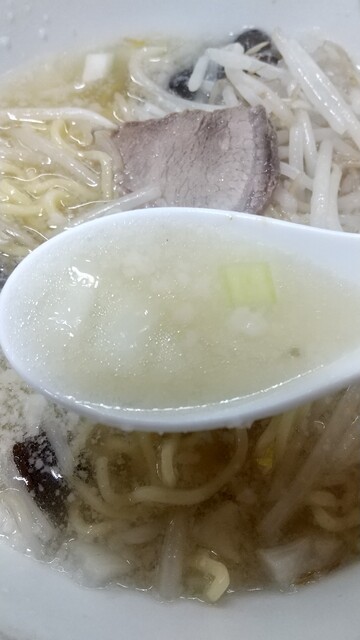 たっぷり背脂の塩スープ、粗みじんな玉ねぎ、ゆでもやし、きくらげはかなり個性的で独特、どうしてこうなったのかな?どこのお店でも見たこと無いラーメン。。。