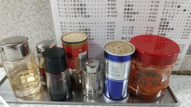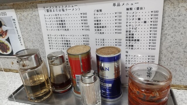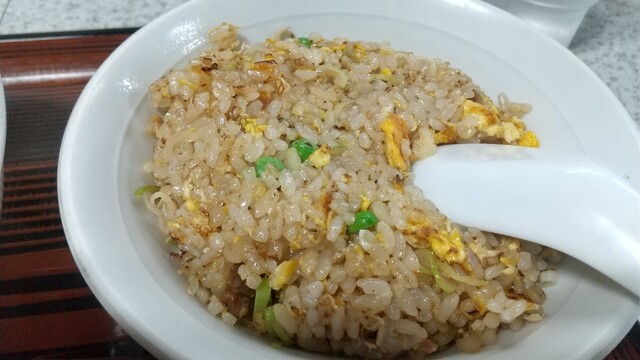 やっと頼んだ半チャーハンは、エンミも胡椒も強めでパンチのある味、パラパラ感とちょい焦げたネギの香ばしさとグリーンピースが印象的、量も多めで基本美味しいチャーハン