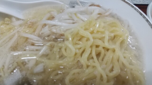 結構背脂が浮かび甘くかつエンミもきつくないマイルドな塩スープ、辛くない粗みじんな玉ねぎも塩背脂のせいで甘みすら感じる、たっぷりゆでもやしはうれしい、玉ねぎやきくらげが普通のラーメンに入るのは珍しい