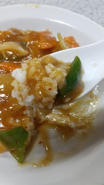 カレーも鍋で一から作る中華カレー、ただ出来上がりはカレー味の中華あんかけ飯の感じかな、胡麻油とカレーの風味が食欲がそそる美味しいカレーでこれも個性的、量も十分