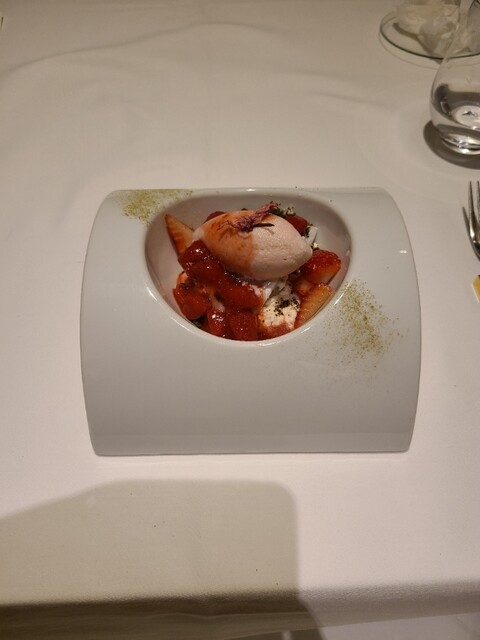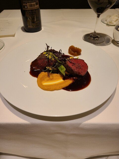 6品目。蝦夷ジカは思ったよりも柔らかく臭みなし。スペイン産のボルドースタイルの赤ワインとともに。タンニンはやや弱めですが赤身のお肉にはちょうどいい。