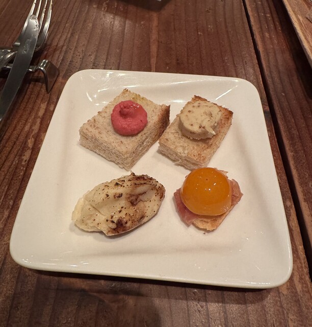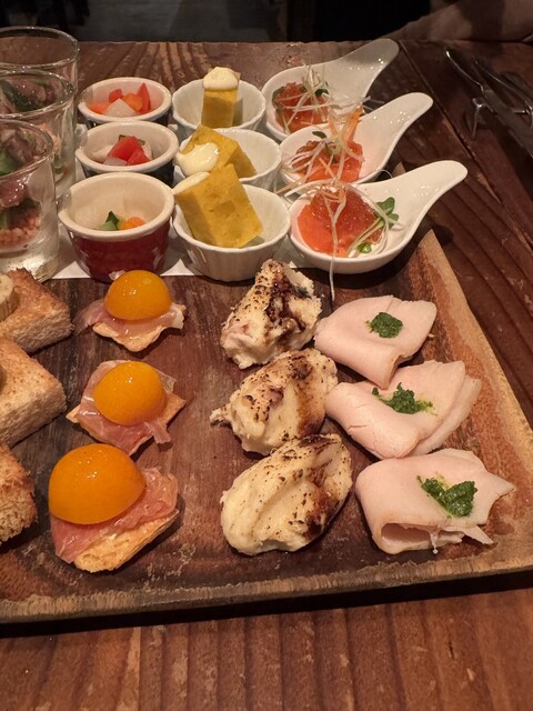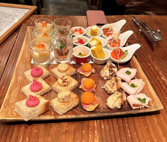 「わぁ凄い!」 お肉や魚料理で、こういった声をあげる事はあれど 【前菜】 において、歓声があがる…なんて事。 滅多にないのではなかろうか。 しかも、見た目だけにあらず。 一口サイズの物がちょこちょこのっているのですが、 どれもこれも、創意工夫がされているので 一口がとっても…ワインに合うっ…!笑 嬉しいスタートになるので、他の料理全てに期待でしかないのが、 こちら... 詳細を見る