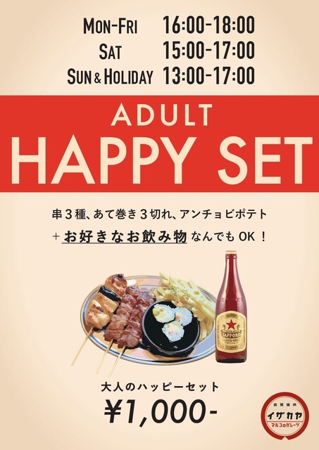 | サービス | 2時間半以上の宴会可、ハッピーアワー、複数言語メニューあり(英語)、デジタルメニューあり |