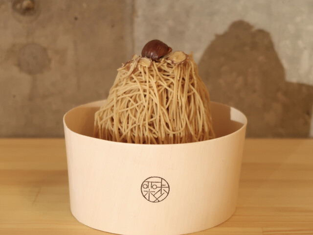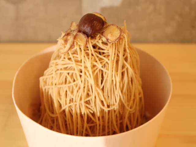 前金制で料金を支払うと、さっそくその場で、極細の栗ペーストを絞り仕上げてくれる。マシンを動かす前には、「写真や動画は撮りますか?」のアナウンス。SNS対策が徹底されている。後からきたおじさんやおばさんは、鼻で笑って大丈夫と答えていたのが印象的。私はがっつりムービー撮りました笑。それにしても当店のモンブランは高い。税抜で¥1800で、税込にすれば¥1980。約¥2000だ。もうひとつのメニューモンブランジェラートでさえ税抜¥1100。この価格帯だけで、勝手にハードルが上がり、ヘタなモンブラン出されようもんなら・・・。