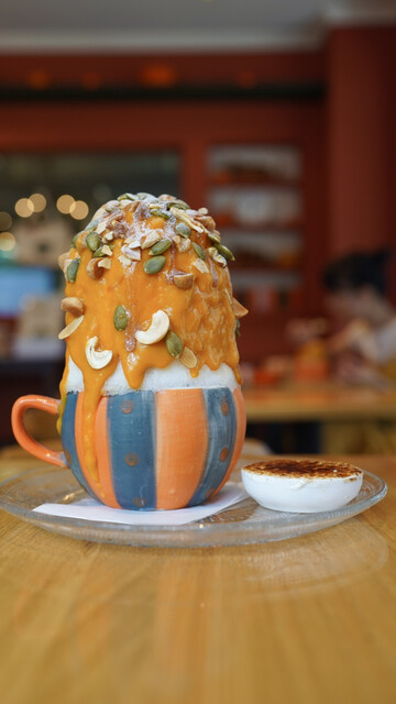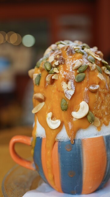 平日予約をして訪問。 7/1からかき氷が始まるとインスタでみて早速伺ってみました。かき氷は完全予約制です。 メニューは2種類で、 カボチャカボチャ1,870円 くりりんキャラメルナッツ1,980円 2つ注文しました。 縦長の愛らしいポップなフォルムが印象的! カボチャカボチ... 詳細を見る