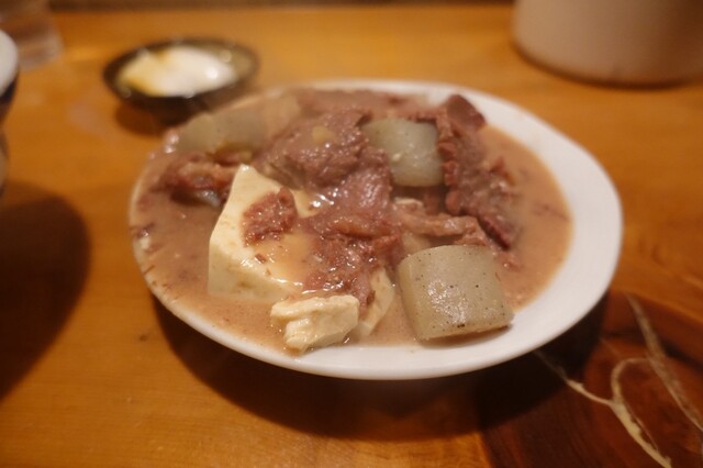 豆腐は角が残っていて、こんにゃくとモツがゴロゴロ